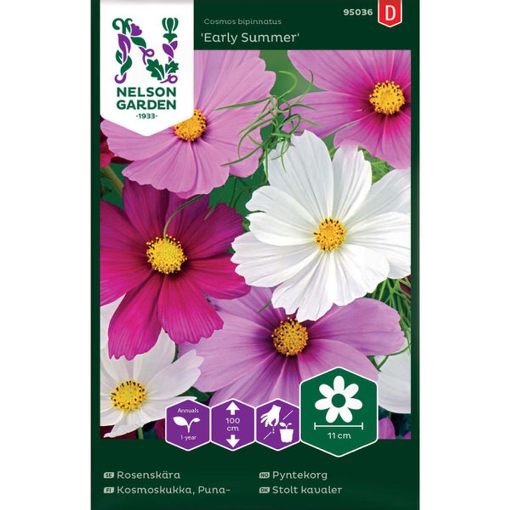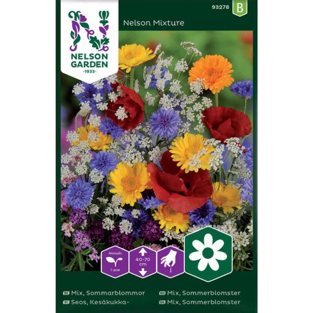 I frøpakken over finner du Ringblomst i en hyggelig blanding sommerblomster, blant annet Kornblomst, Asters, Sinnia,og Romersk ridderspore. Nelson Gardens sommerblomstmix kan direktesåes ute når jorden er klar frem til juni. De trives i næringsrik, veldrenert jord. Se også Sommerblomst mix ´Pink Shades´ for en blanding lettdyrkete blomster i lyse og mørke rosa fargetoner.