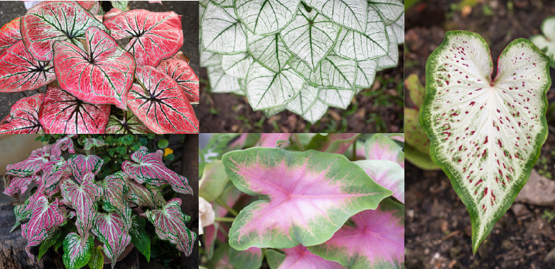 Botanisk navn: Caladium. Den vanligste arten er Caladium Bicolor (bicolor=tofarget) med over 1000 kultivarer. De kalles også Caladium Droplerot. Bildene over viser kultivarer av denne arten.
